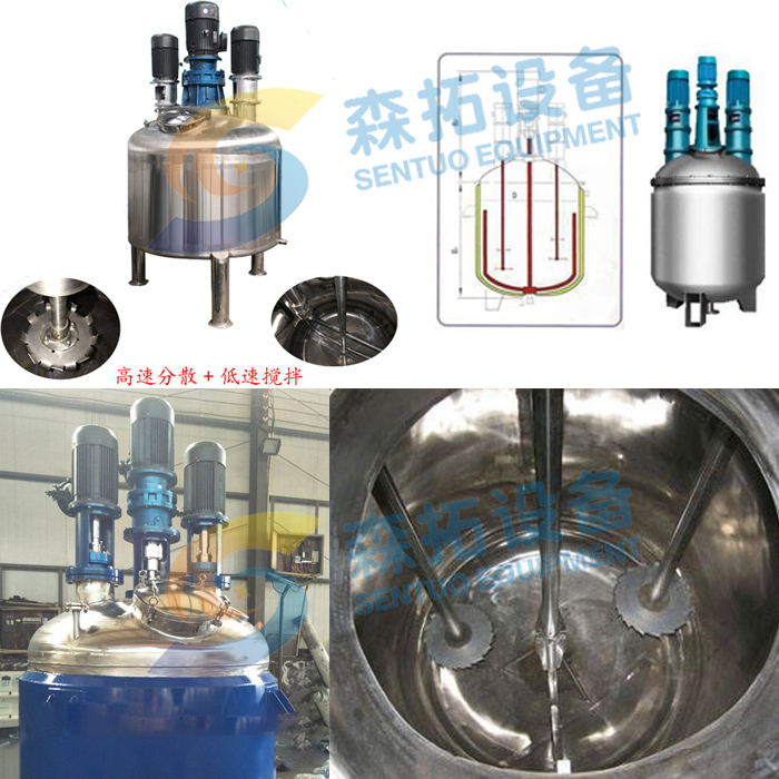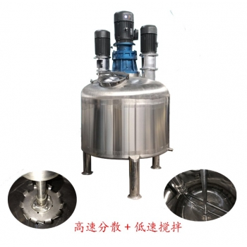 FS高速分散攪拌釜是由一個(gè)低速錨框式攪拌和兩個(gè)高速分散攪拌機(jī)組成,實(shí)現(xiàn)雙軸高速分散功能、低速強(qiáng)力攪拌、刮壁粘稠物料,三個(gè)電機(jī)安裝在封頭機(jī)座上,同時(shí)分散攪拌,多功能工藝一體完成,高剪切、分散、攪拌、溶解,調(diào)勻混合。