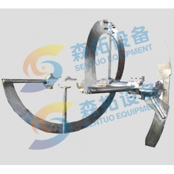 適用于高粘度流體,通常在層流狀態(tài)下操作,離壁較近,傳熱系數(shù)較高。可通過(guò)調(diào)節(jié)螺帶的寬度、螺距等參數(shù)以適應(yīng)不同的需求。螺帶攪拌器往往與錨式攪拌器配合使用,可防止橢圓底出現(xiàn)混合死角。