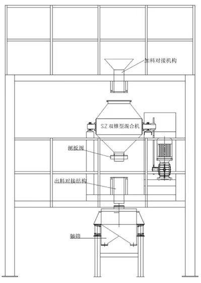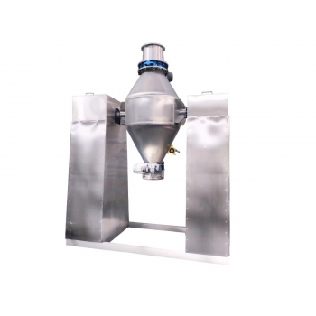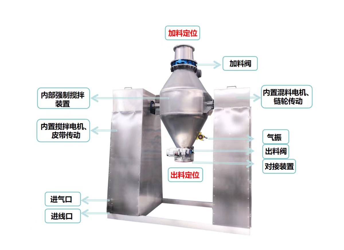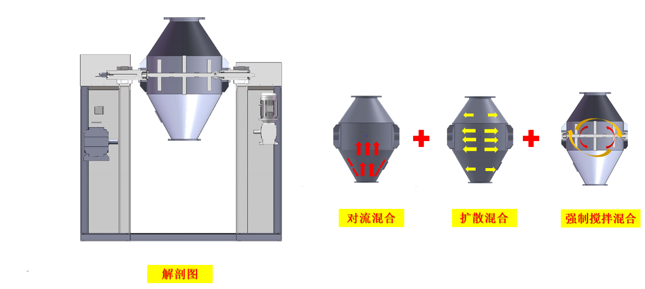 工作時采用真空輸送將粉末或人工加料到雙錐容器中,隨著容器的不斷旋轉(zhuǎn).物料在容器中進行復雜的撞擊運動,達到均勻的混合效果。