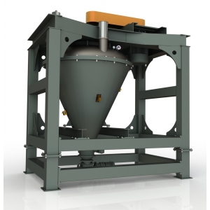 混合腔體為錐形桶體結(jié)構(gòu),并配有中心轉(zhuǎn)軸,轉(zhuǎn)軸上裝有沿著桶壁轉(zhuǎn)動的刀片,通過轉(zhuǎn)軸刀片高速運轉(zhuǎn)產(chǎn)生強(qiáng)離心力將物料推向混合腔體內(nèi)壁,同時混料錐體內(nèi)壁及轉(zhuǎn)軸刀片會形成向上旋轉(zhuǎn)推力,使粉體沿錐體內(nèi)壁向上運動,將粉料由底部帶至混合腔頂部。當(dāng)產(chǎn)品到達(dá)頂部時,再由弧形機(jī)蓋引導(dǎo)到混合機(jī)的中心,并回落到混合腔的底部,重新開始新一輪的混合過程,如此循環(huán)往復(fù);物料在錐桶內(nèi)提升及回落過程中,會受到開刃刀片、混料桿的強(qiáng)力打散及剪切,從而達(dá)到快速均勻分散混合的效果。